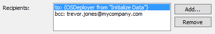 Add a recipient email address.  Since I want to send the email to the IT admin who is deploying the machine, I use a custom variable ‘OSDeployer’ populated by the admin in the UDI wizard, adding it via the Published Data as before.  I also bcc myself 🙂