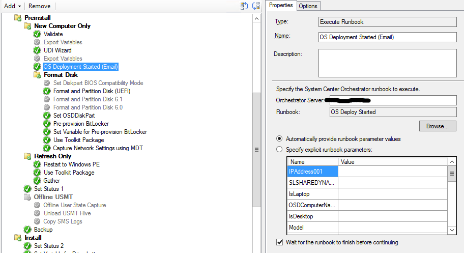 messageSave the runbook, then head over to your SCCM/MDT server.  Edit your Deployment task sequence and add an ‘Execute Runbook’ step from the menu.  Be sure to add it after a ‘Gather’ step and before a ‘Reboot Computer’ step, so all the variables are present in the TS environment.  Enter the name of your Orchestrator server and click Browse to choose the runbook.  As long as your parameters are named identically to the TS variables, you can choose the ‘Automatically provide runbook parameter values’ option.  Be sure to also check ‘Wait for the runbook to finish before continuing’, or the email won’t be sent.