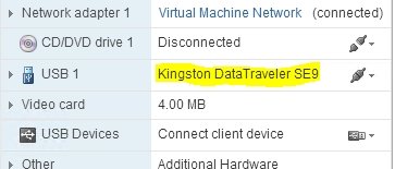 Then in the ‘Summary’ page of the VM, in the ‘VMWare Hardware’ section, you’ll see ‘USB Devices’. Click ‘Connect client device’ and choose your locally connected USB storage device.