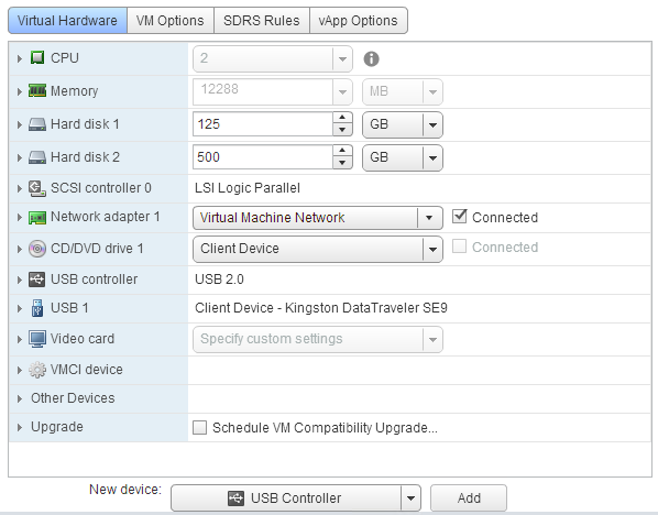 The first thing you need to do is add a USB controller to your VM. Edit the settings of your VM, go to ‘New Device’ and add the ‘USB Controller’. Click OK to save the settings.