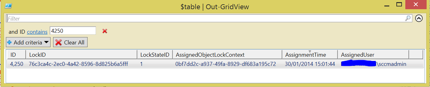If it’s something that you think was locked recently, you can sort by the ‘AssignmentTime’ column and find the latest one.  Or if you think it was done by a specific user account, you can sort by ‘AssignedUser’.