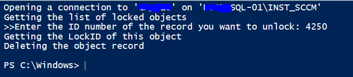 1. True Torsten, thanks for pointing it out! The Unlock-CMObject cmdlet is available since SP1 and is good if you have the name or the package ID of the locked object. I still like this way of getting the list of locked items directly from the database and just entering the ID, though not a supported method, as you say.