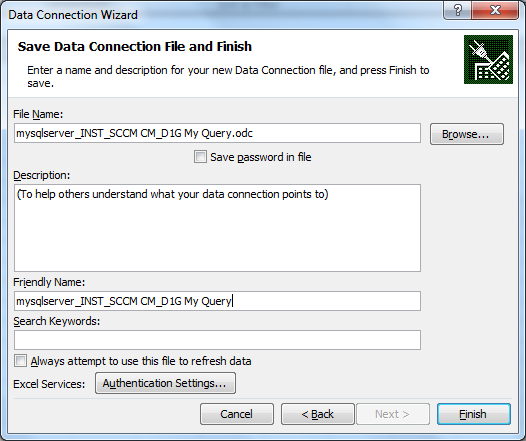 dataconn2Click Next.  You can change the File Name and Friendly Name of the data connection to make it more obvious as to what data it is getting, and to distinguish it from other data connections you may create in the workbook.