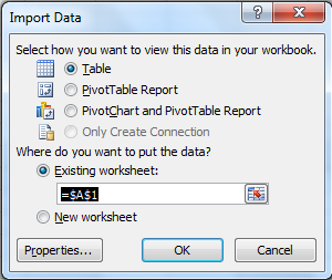 Back in the Import Data window, make sure that Table is selected and the cell range =$A$1 in the Existing worksheet, then click OK.