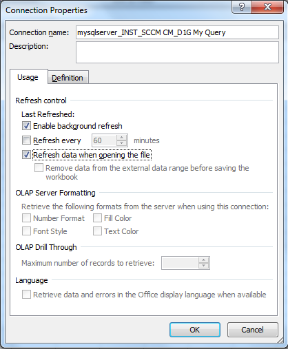 dataconn4In the Connection Properties window, on the Usage tab, make sure that Enable background refresh is selected, and also Refresh data when opening the file.