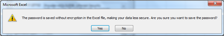 dataconn5On the Definition tab, check the option Save password.  You will be prompted to allow the saving of the password unencrypted in the Excel file.  Click Yes.