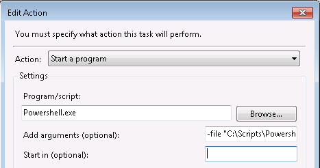 Create a new scheduled task and enter the action as ‘Start a program’: