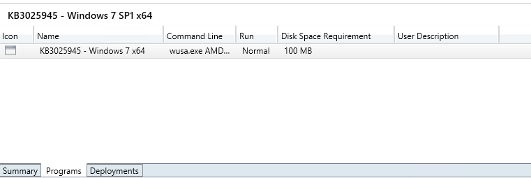 This script creates packages and programs for KB3025945, distributes the packages and deploys them.