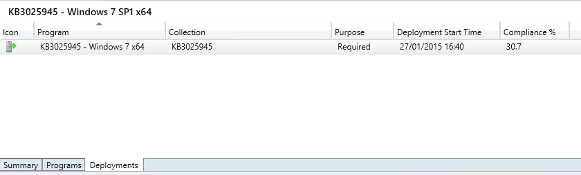 That’s it! Installation logging will appear in the WindowsUpdate.log on the client. Since we did not enforce a reboot the clients will install the patch, but it will remain in the ‘reboot pending’ state until a reboot has been performed. You can monitor your deployment using the standard methods in the ConfigMgr console or the built-in reports.