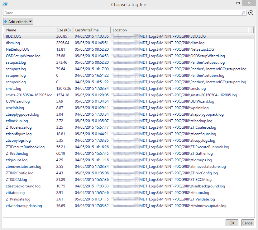 I saw an interesting post yesterday by Keith Garner on using PowerShell’s “Select-string” to search OS deployment logs and find errors by searching on the entry type instead of the usual way that the CMTrace utility does it – by highlighting keywords. I decided to take the idea further and create a script that will search my deployment logging shares, allow me to choose which deployed computer to search on, which log file to search, and then return the errors into CMTrace for easy viewing.