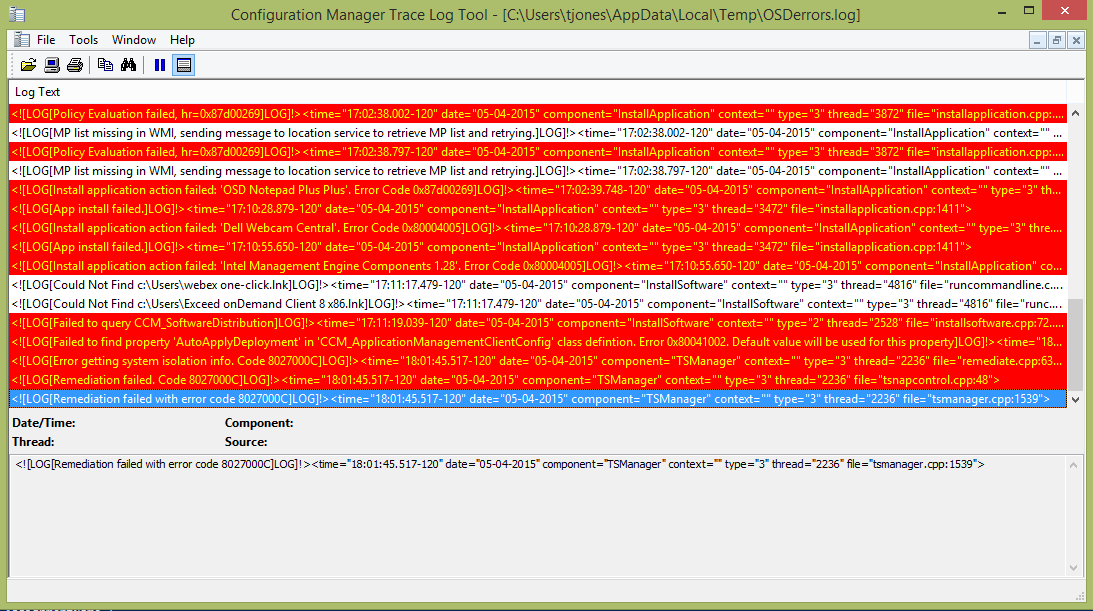 I want to search the smsts.log for errors, so I select it and click OK. It then puts all the errors into a temporary log file and invokes it. As .log files open with CMTrace by default, I can read through the errors more easily.