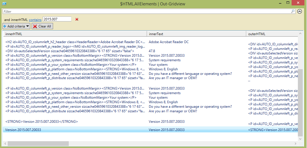 $URI = "https://get.adobe.com/uk/reader/" $HTML = Invoke-WebRequest -Uri $URI $HTML.AllElements | Out-Gridview
