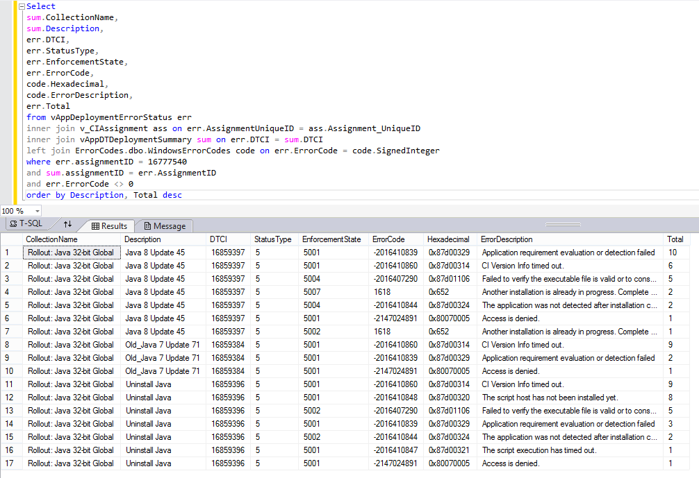 In a recent post, I described different ways to translate error codes for Windows and Configuration Manager into their friendly descriptions.  In this post, I will show you how to create a SQL database of known error codes and descriptions that you can join to in your SQL queries, to help simplify your troubleshooting, and I will also give some example queries you can use with Configuration Manager.