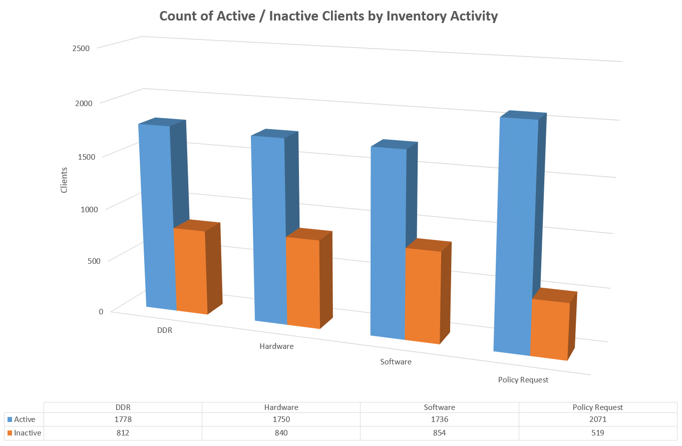 - Clients that are active or inactive for DDR (heartbeat discovery), hardware inventory, software inventory, policy requests and status messages