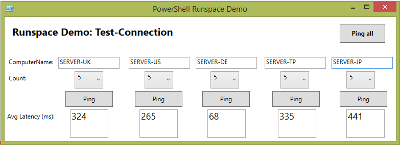 Take for example this simple WPF application I built, which uses PowerShell’s Test-Connection cmdlet to “ping” up to 5 servers and get the network latency, or response delay: