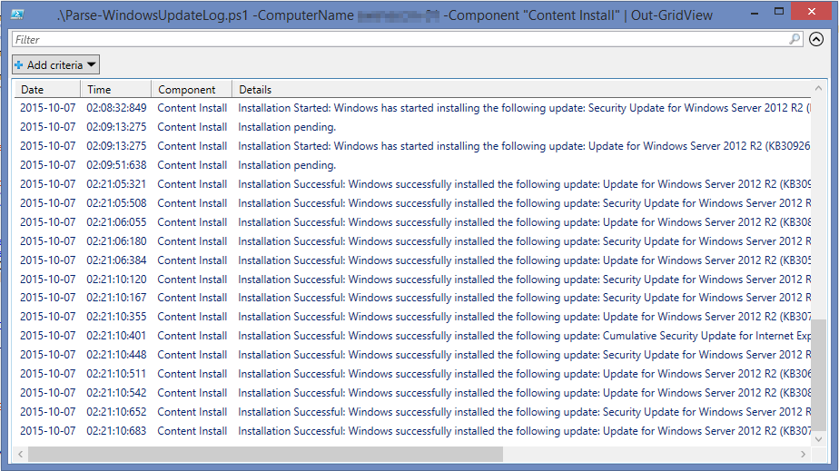 Parse-WindowsUpdateLog.ps1 -Component "Content Install" | Out-Gridview
