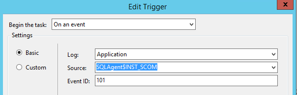 - Create a scheduled task on each server, running as an account that has the appropriate permissions on each instance. Add 2 triggers – one for each SQL instance – and use the event trigger. You can use event ID 101, for example, to identify when a SQL instance becomes active on that node. As the source, use the “SQLAgent$<instancename>”.