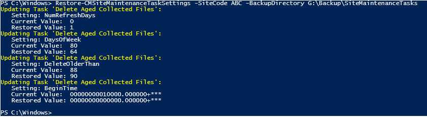 Restore-CMSiteMaintenanceTaskSettings -SiteCode ABC -BackupDirectory G:\Backup\SiteMaintenanceTasks