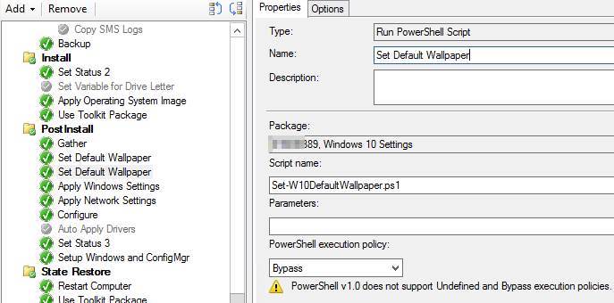 So finally I got around to doing some Windows 10 deployments (better late than never :)) and I wanted to set the default wallpaper during Operating System deployment with Configuration Manager. I’ve seen a few posts out there about how to do that, but they all run during the OS phase of the deployment, which means you have to take ownership and set permissions on all the image files. However,  you can bypass those permission changes by setting the wallpaper during the WinPE phase of the deployment instead.