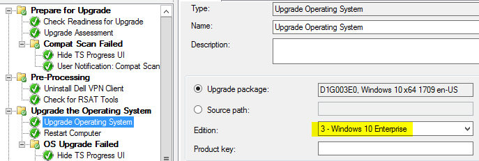 Of course, I expected the TS to fail because the configured edition is different to the edition that TS was being run on – but to my surprise, it didn’t care and the TS succeeded! Windows 10 Pro 1703 was upgraded to Windows 10 Pro 1709.