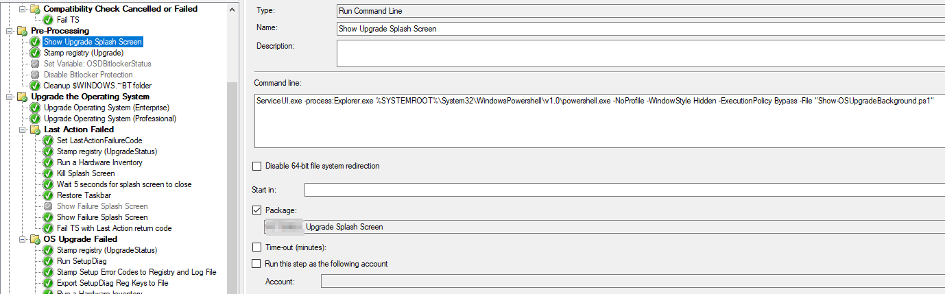 To call the splash screen, add a Run Command Line step to your upgrade task sequence and call the main script via Service UI, referencing the package:
