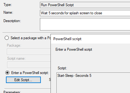 The second step just runs a PowerShell script to wait 5 seconds for the splash screen to close