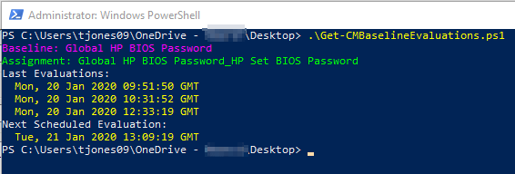 To review the most recent evaluation times and the next scheduled evaluation time, I had to read the scheduler.log in the CCM\Logs directory, because I could only find a single last evaluation time recorded in WMI.