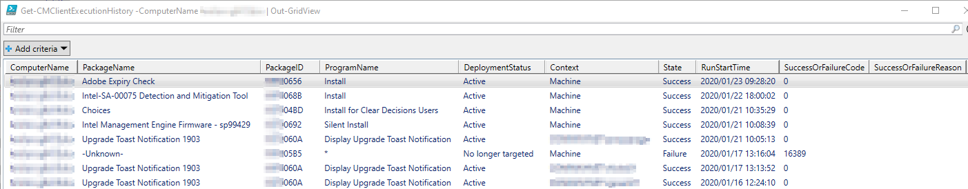 Get-CMClientExecutionHistory -Computername PC001,PC002 | Out-GridView