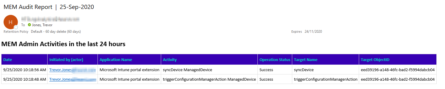 Admin actions are already audited for you in MEM (Tenant Administration > Audit logs) so it’s simply a case of getting that data into an email report. You can do this with Graph (which gives you more data actually) but I decided to use Log Analytics for this instead.