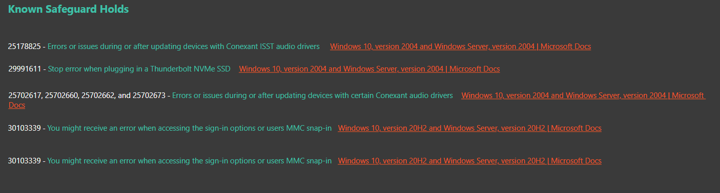 There are pages for 2004 and 20H2, as well as a page listing some of the known Safeguard hold IDs that have been publicly disclosed by Microsoft.