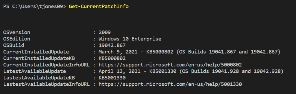 I was working on some updates to our unified reporting solution for Windows Updates (ie WUfB + MEMCM) and I wanted to figure out simply from the OS build number whether a Windows 10 workstation has the latest cumulative update installed. The only reliable and useable static list I could find for Windows 10 build numbers is Microsoft’s Windows 10 Update History web page, so I decided to build a PowerShell script that parses the page to get current patch info.