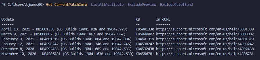 Get-CurrentPatchInfo -ListAvailable -ExcludePreview -ExcludeOutofBand