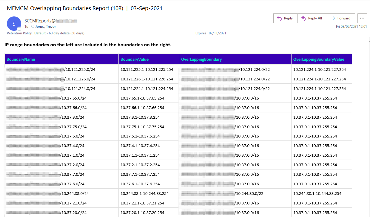 I prepared the following script that could be run as a scheduled task to send an email report on any IP range boundaries that overlap with other boundaries. The boundaries on the left side of the table have IP ranges that are covered by (included in) the boundaries on the right side.