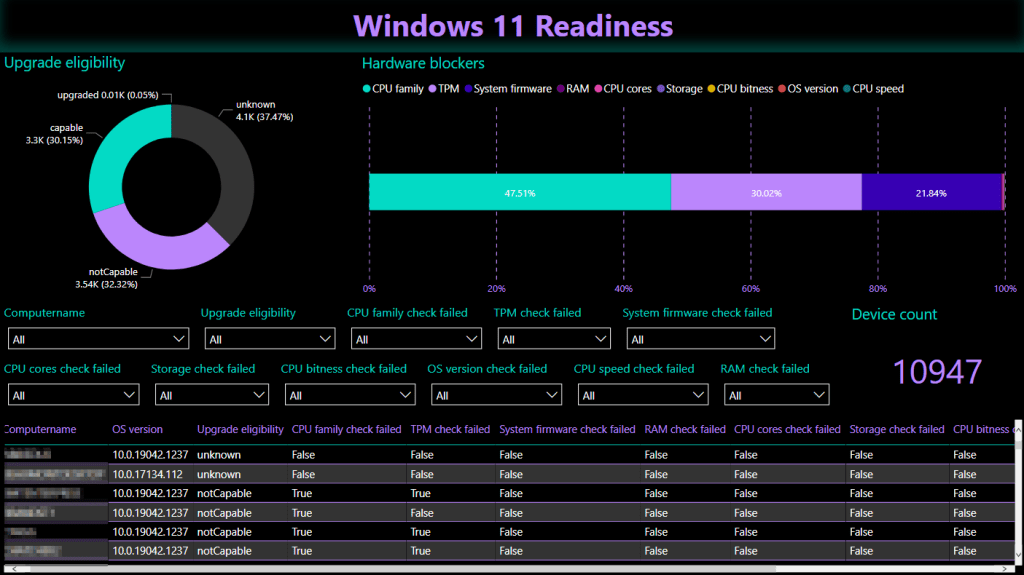 You could further expand this report if you wish to pull in inventory data from MEMCM for example, matching devices on their Intune device ID to provide additional detail on CPU, TPM, storage etc for any devices that aren’t capable of meeting the official requirements for Windows 11.