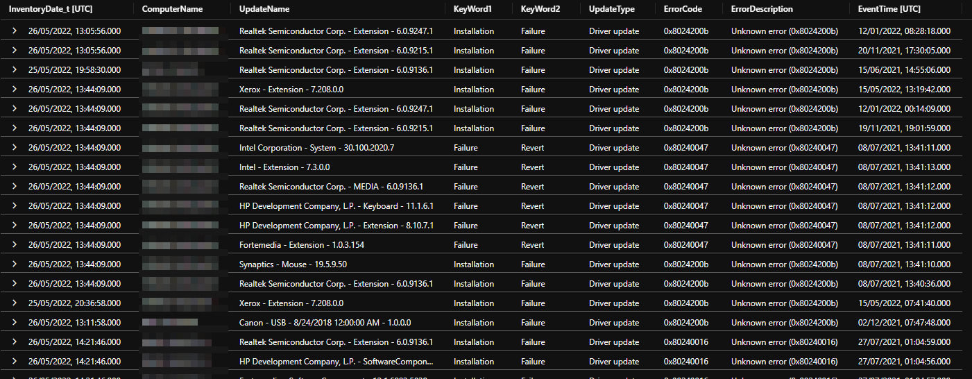 | SU_UpdateLog_CL | Entries from the System event log and the Microsoft-Windows-WindowsUpdateClient provider. Includes only the most recent event per update. Updates are categorised. This is a handy source for quickly identifying which updates have attempted to install by WU, when, and whether they succeeded. |