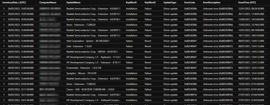 | where KeyWord2_s in ("Failure","Revert") and UpdateType_s == "Driver update"