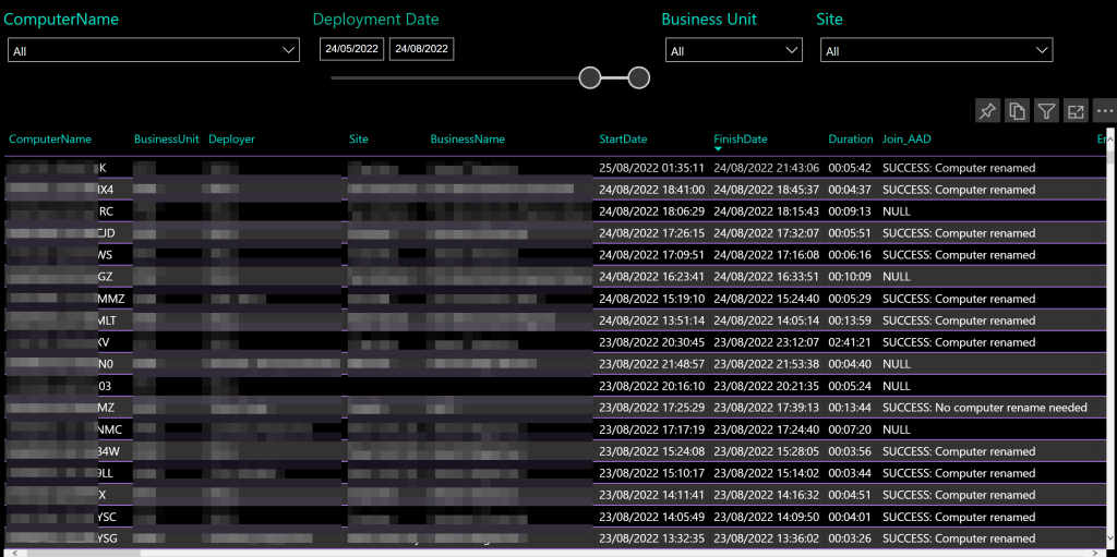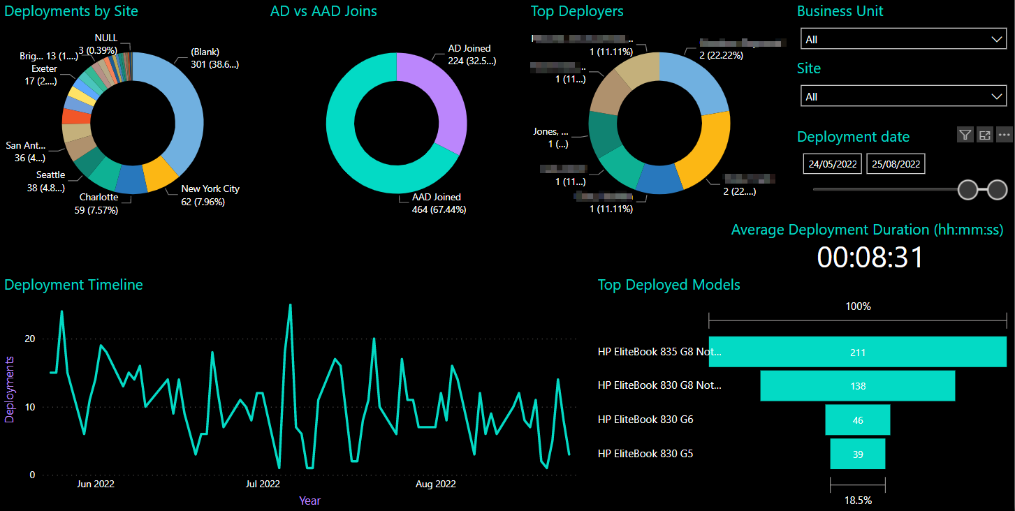 We have a dashboard with deployments by site, AD vs AAD joins, top deployers, top models, average deployment duration and a deployment timeline.