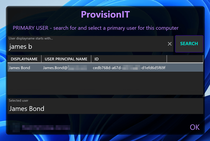 Click Next and you are asked to select the Primary user for the workstation in Intune. You enter the search criteria and this executes a Graph request displaying the results in the table. Select the relevant user from the table.