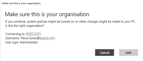 Click OK and then you are asked to join Azure AD. Click the Join Azure AD button and it brings up the native AAD join experience. Rather than use a bulk enrolment token that needs to be regularly refreshed and joins AAD in a userless context, I prefer to interact with the deployer and get them to join AAD using the built-in process. This will also enrol the device into Intune as the deployer will be configured for MDM auto-enrolment in the MDM user scope.