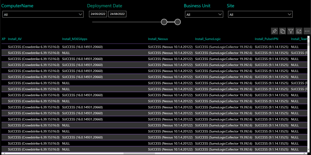 Just before the provisioning process finishes, we fire off a ‘status message’ which contains a summary of the deployment, which activities were performed and their status etc. This gets sent as an http request to Azure Event Grid (for speed and resilience). Event grid passes the data to an Azure function via a subscription and the Azure function injects the data into an Azure SQL database. This database then becomes the source for our Power BI deployment report.