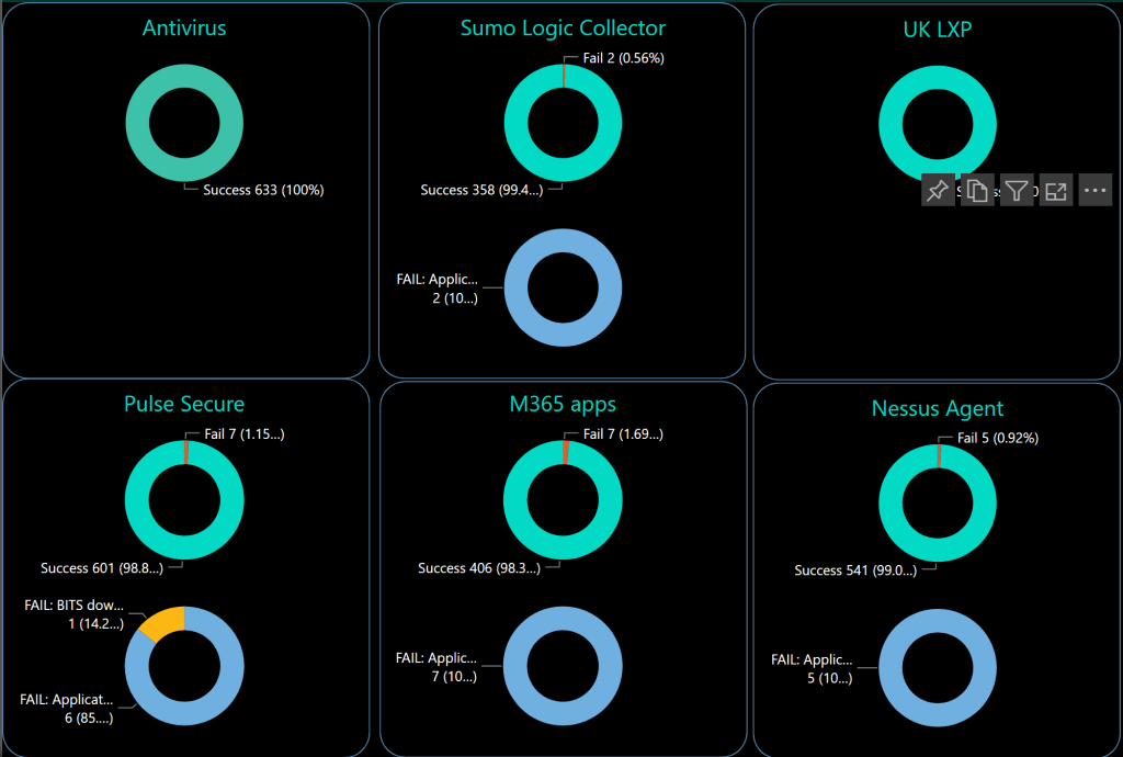 We can review the different provisioning activities and their success rates, for example for software installs: