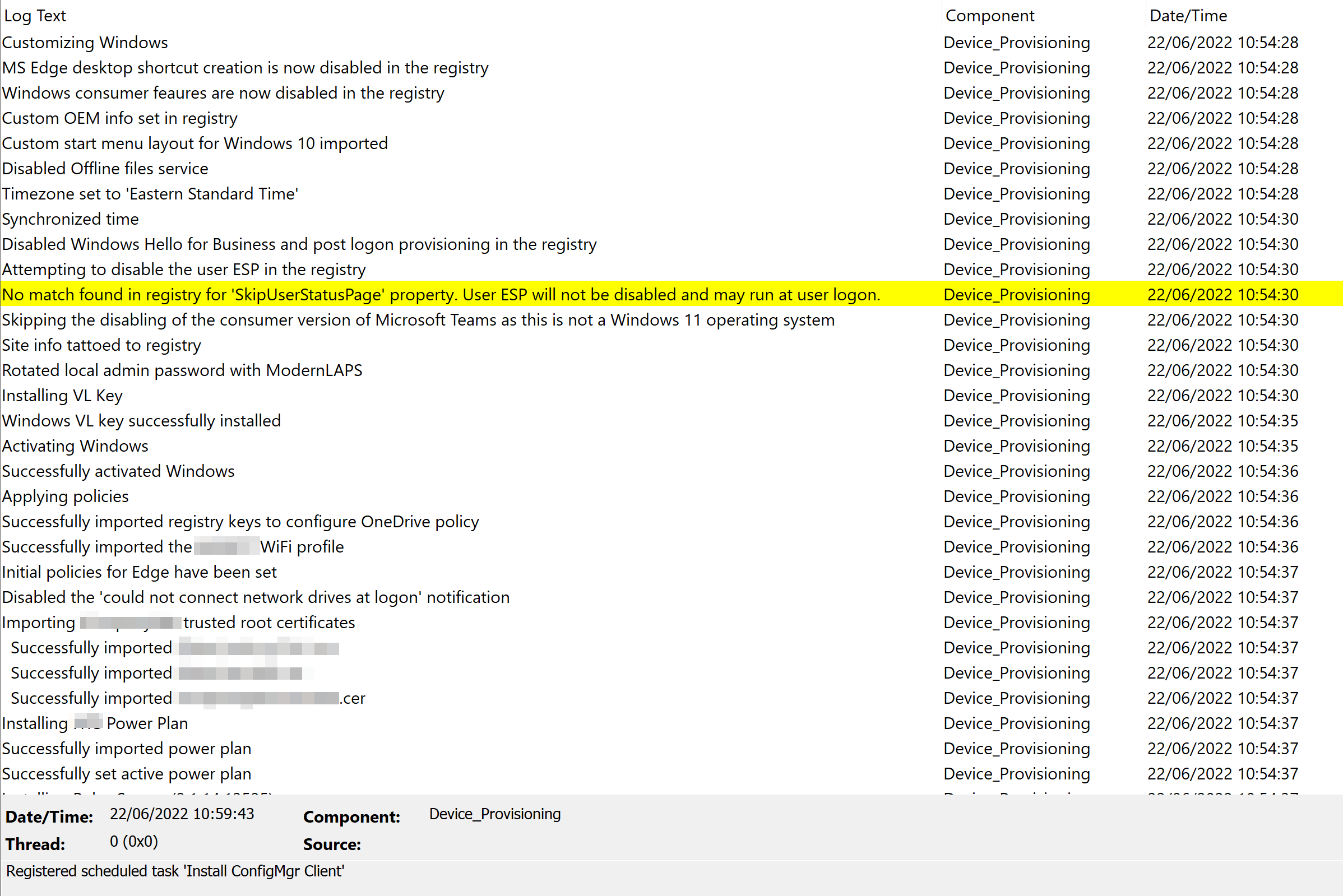 We also do reasonably detailed logging during the provisioning process to a local log file. This is then uploaded to an Azure storage account at the end of the process so we have a central place for all our deployment logs and can view detailed deployment info per device if we need to troubleshoot anything.