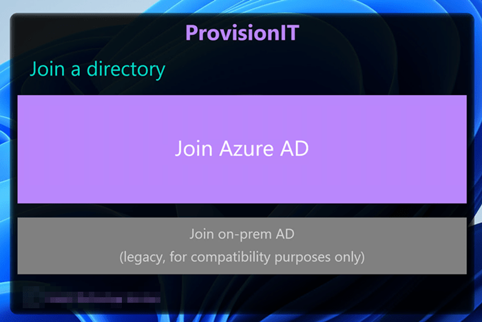 Assuming its a vanilla build, it will then display the directory join window. Our default is to join Azure AD, but we have the option to join the AD domain where this may still be required. In this blog, we’ll choose the Join Azure AD option.