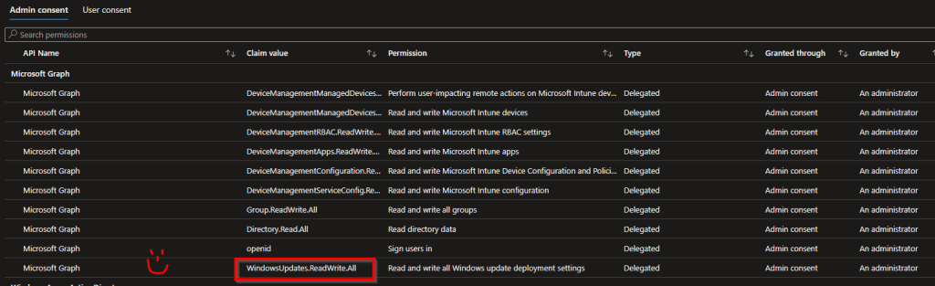 However, the enterprise app for that PowerShell module doesn’t contain the required permission in its default delegated permission set. I don’t know why it took so long to figure this out, but to add the delegated permission I needed to use the Microsoft Graph PowerShell SDK (I believe the Application.ReadWrite.All permission is required for this.) The code below basically adds the permission as an “Oauth2 permission grant” on the app, and adds the additional WindowsUpdates.ReadWrite.All permission while retaining the existing permissions.