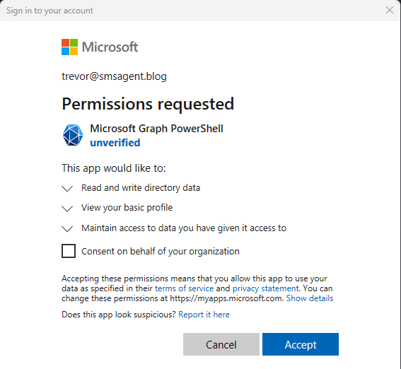 If you prefer an easier life (something I need to learn!!) you can just use the Microsoft Graph PowerShell module. To add the additional delegated permission, you can use the code above and just change the enterprise app name, or simply specify the permission as a scope when you connect – if you have the Global Admin role you can consent for your organization.