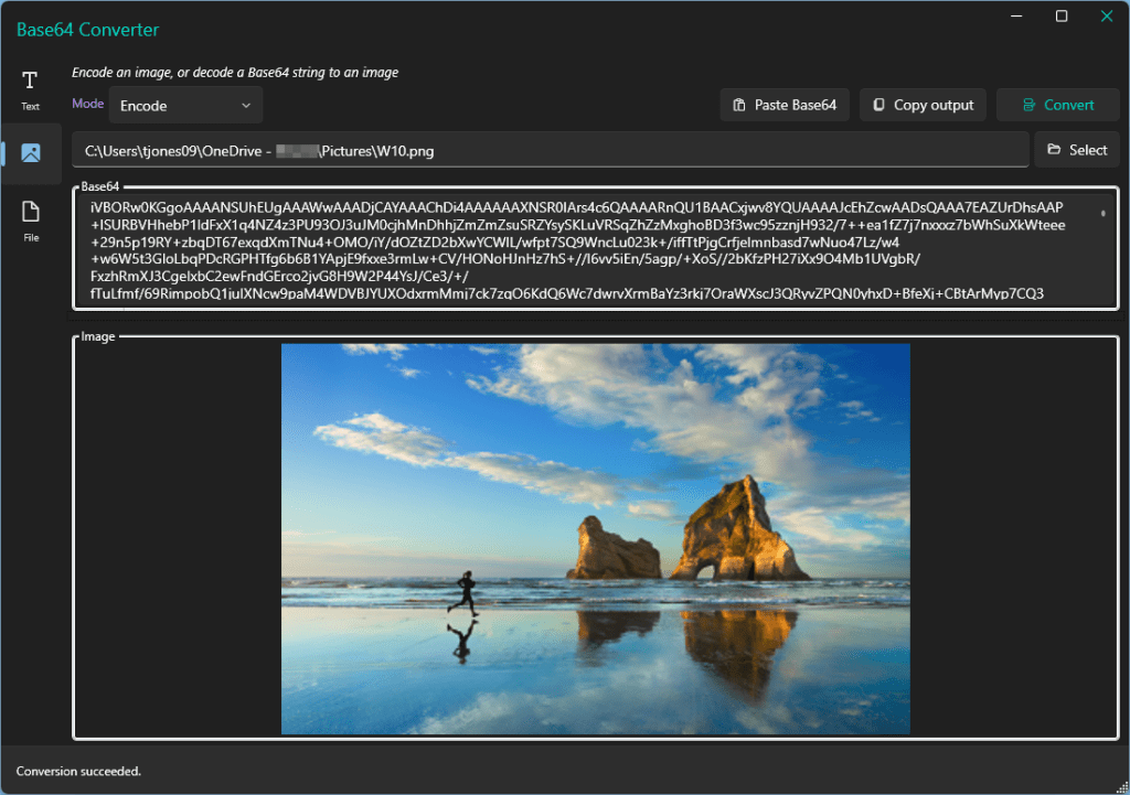The tool can encode and decode either text, images or any kind of file. You can also use it to convert images from one format to another – simply open an image an encode to Base64, then decode the Base64 and save it with the file extension you want to convert it to.
