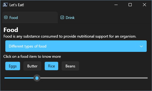 | <TextBlock Text="Food is any substance consumed to provide nutritional support for an organism." /> | |