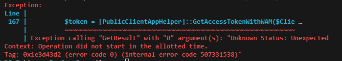 Figuring out how to use WAM in PowerShell was a more challenging endeavour than I anticipated though! Similar to before, I wrote wrapper code around the Microsoft.Identity.Client library, but this time it didn’t play so well. The main hurdle I couldn’t overcome was that to use the WAM broker, it is necessary to call an extension method on the PublicClientApplicationBuilder called “WithBroker”. This method exists in the Microsoft.Identity.Client library, however the method that works with the WAM broker is in a separate library – Microsoft.Identity.Client.Broker. No amount of my trying could get PowerShell to use this extension method instead of the native one. Probably at some point this extension method will find its way into the main library, but until then the only way I could make this work was to port some C# code into PowerShell.