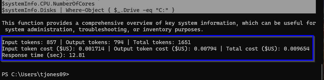 Remember that you are charged for your use of the AI models by token usage. If you want to see how many tokens were used in your request, add the -IncludeTokenUsage parameter. Token usage as well as approximate cost and the response time will be added to the end of your response.