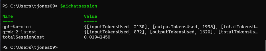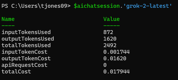 Token usage and cost statistics for chats in your current PowerShell session are saved to the global variable $aichatsession. Here you can see the approximate total cost of all your chat interactions so far, as well as accumulated values per AI model. This is handy for keeping track of spend.